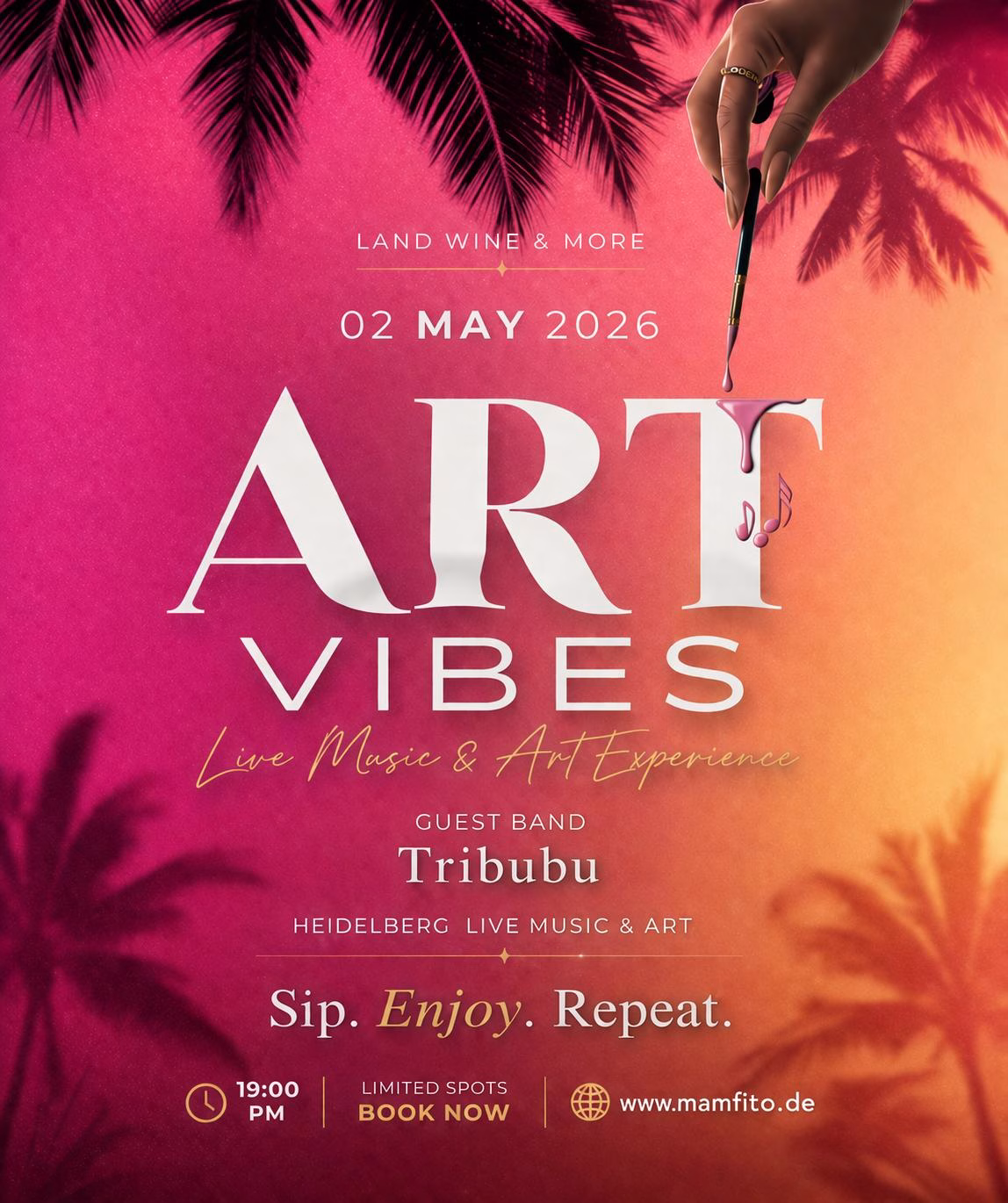 Am 02. Mai 2026 erwartet euch im L’AND Wine & More ein ganz besonderes Highlight mit Live-Musik von der internationalen Band Tribubu, während wir ein einzigartiges Sip & Paint Experience genießen.